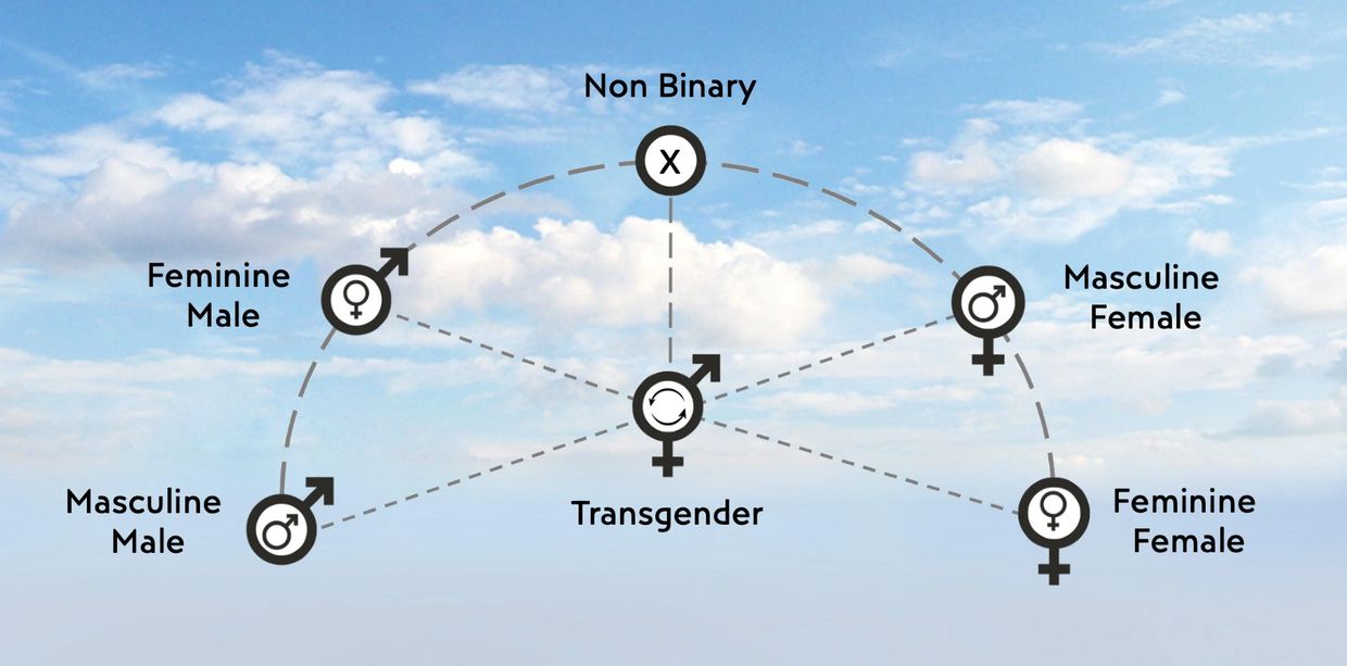 On either side of the non-binary in the diagram is the masculine / feminine males and the masculine / feminine females.