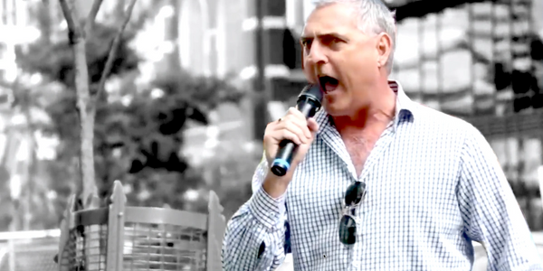Guy rouses the rabble at a Stop Adani climate rally with the slogan: "GHD! GHD! Do Not Take Blood Money!" Brisbane, August 2019.