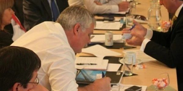 Guy (top right) gets seriously schooled about the real world by executives in the cruise and oil industry at Richard Branson's Carbon War Room event in London, 2011.