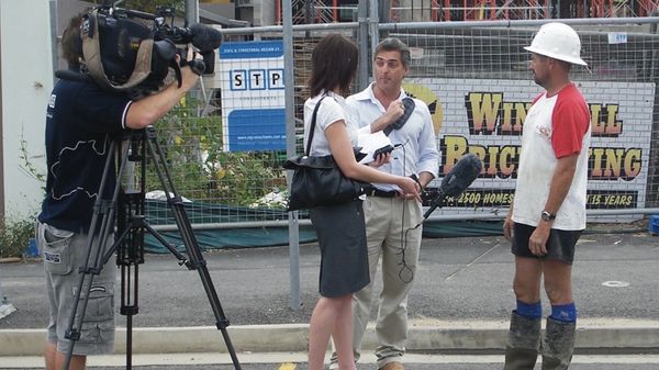 Guy works with journalists to tell a story about a green building construction project in Townsville, 2007. Clive, the concreter, was surprised to have been nominated by the foreman to partake in a SEA O2 press event. He didn't even know that the electric crane ran on Green Power.