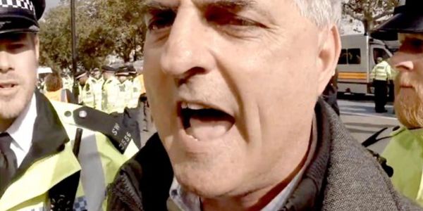 Guy gets moved along by British police as he delivers a piece to camera at the Extinction Rebellion event outside M15 offices in London October 2019. "We don't have to go extinct!"